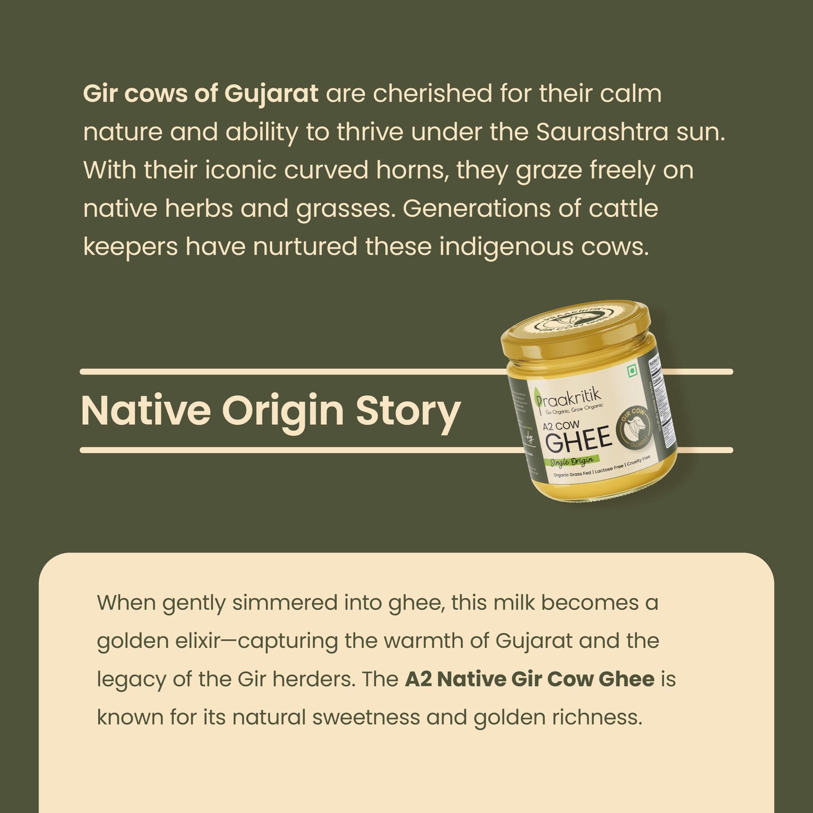 + Free ShippingOur 100% Organic Desi Gir Cow A2 Ghee, is crafted by the traditional method of churning curd made from the milk of grass-fed gir cows in Maharashtra and Gujarat.