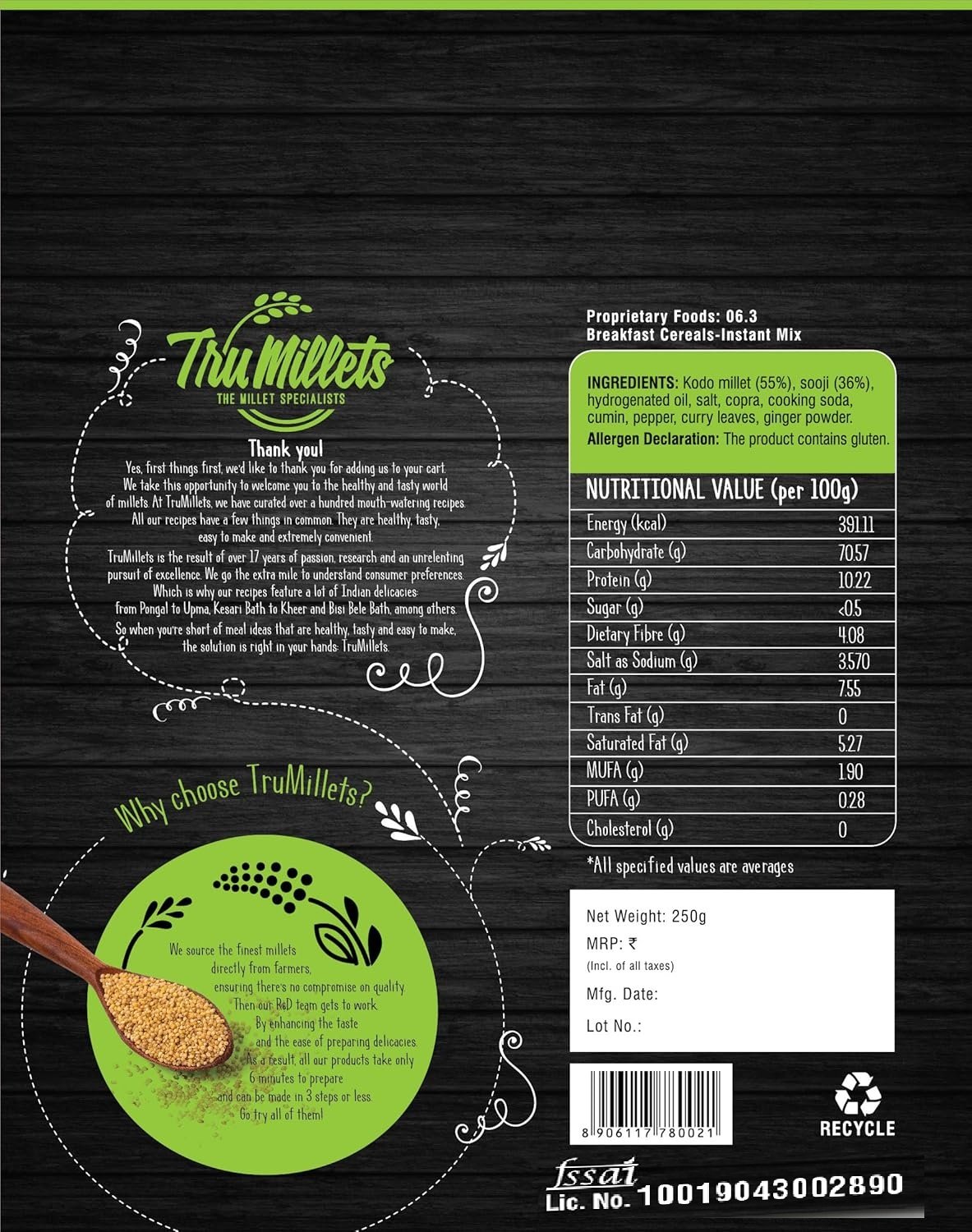 Quick and convenient to prepare, TruMillets Kanjeevaram Idli Mix allows you to enjoy traditional flavours without compromising on health. Serve it hot with coconut chutney and sambar for a truly authentic South Indian experience.