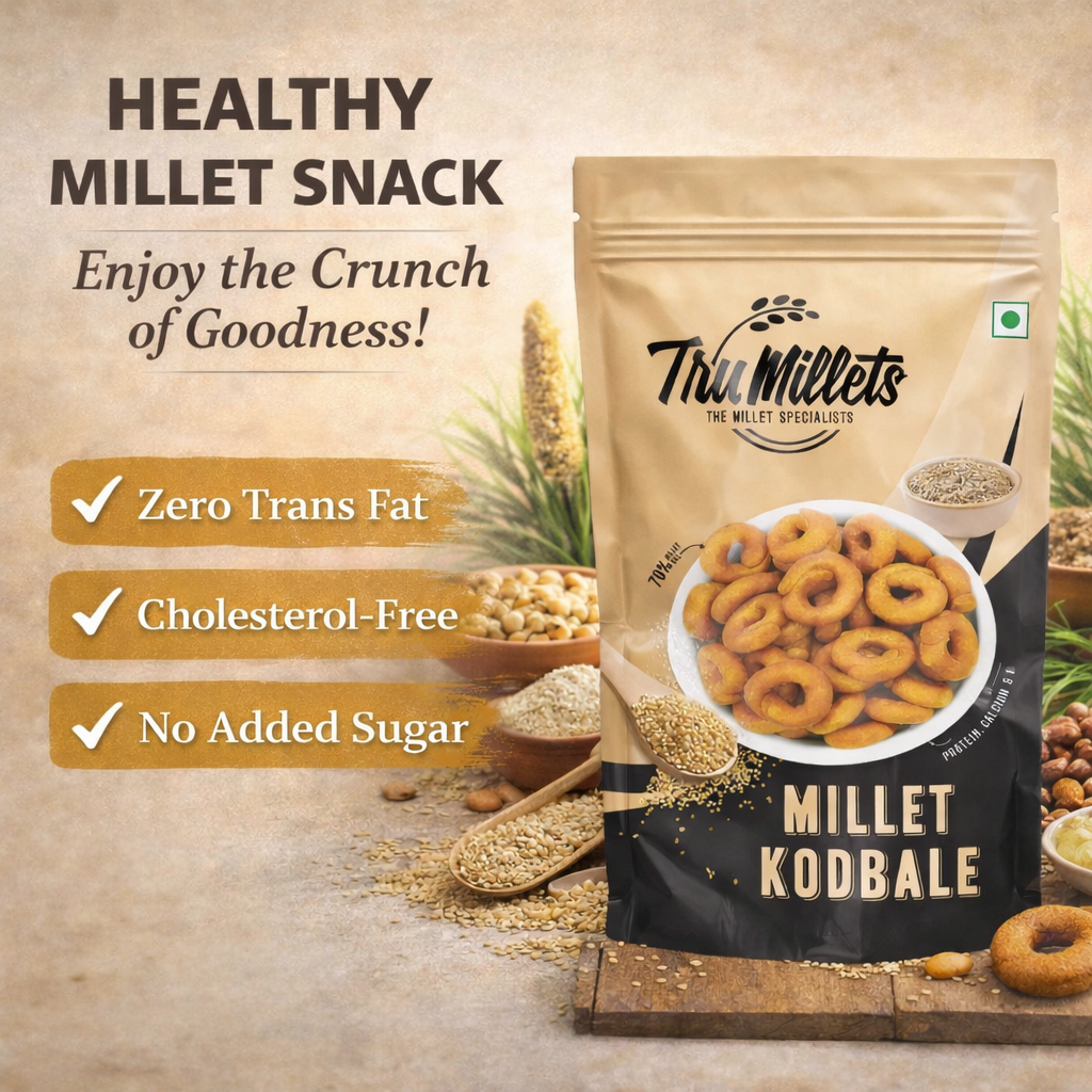 Naturally rich in protein, dietary fibre, calcium, potassium, and iron, TruMillets Kodo Millet Kodbale helps support digestion, sustained energy, and overall wellness. Free from trans fats, cholesterol, and added sugar, it offers a clean and mindful snacking option suitable for any time of the day.