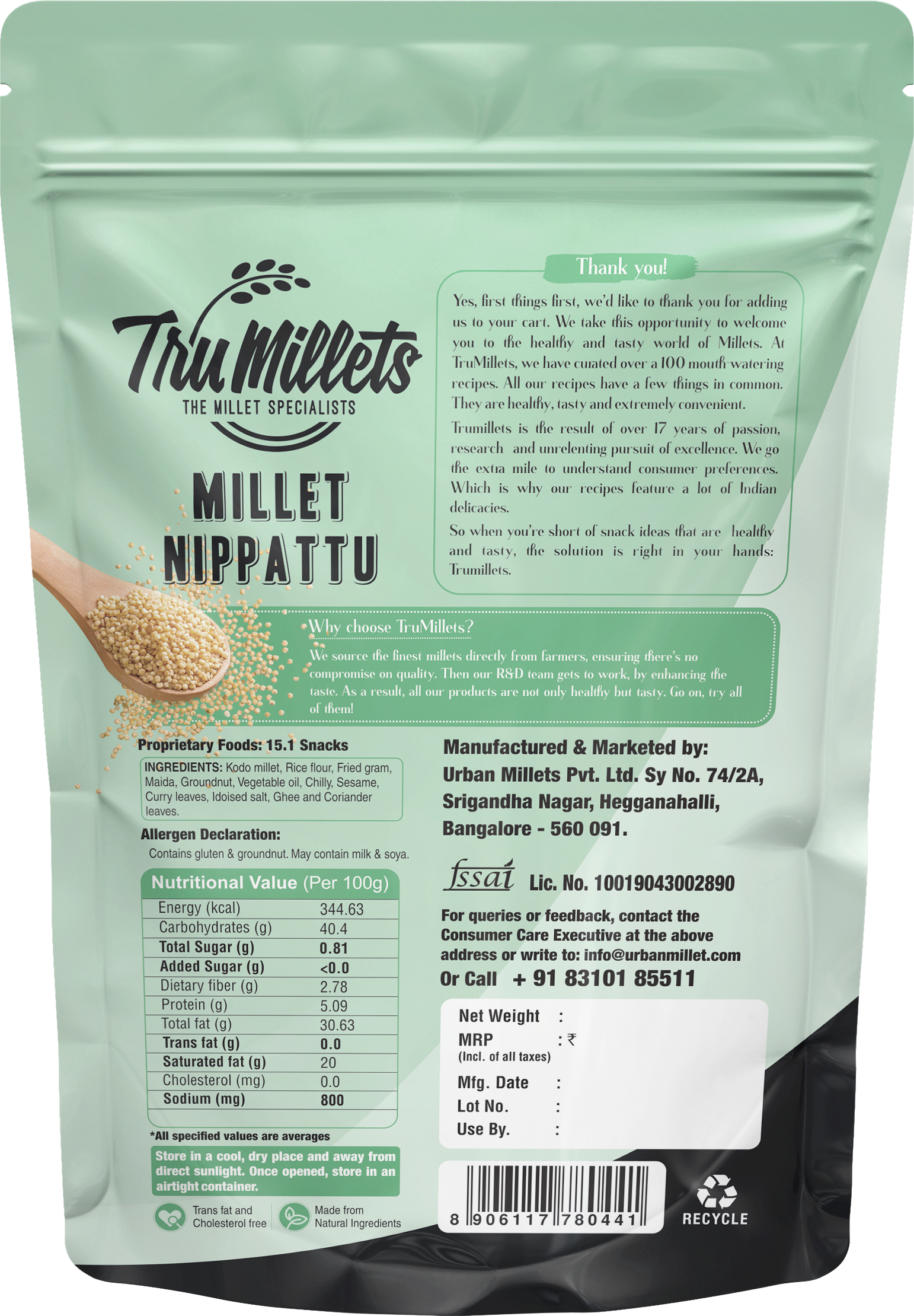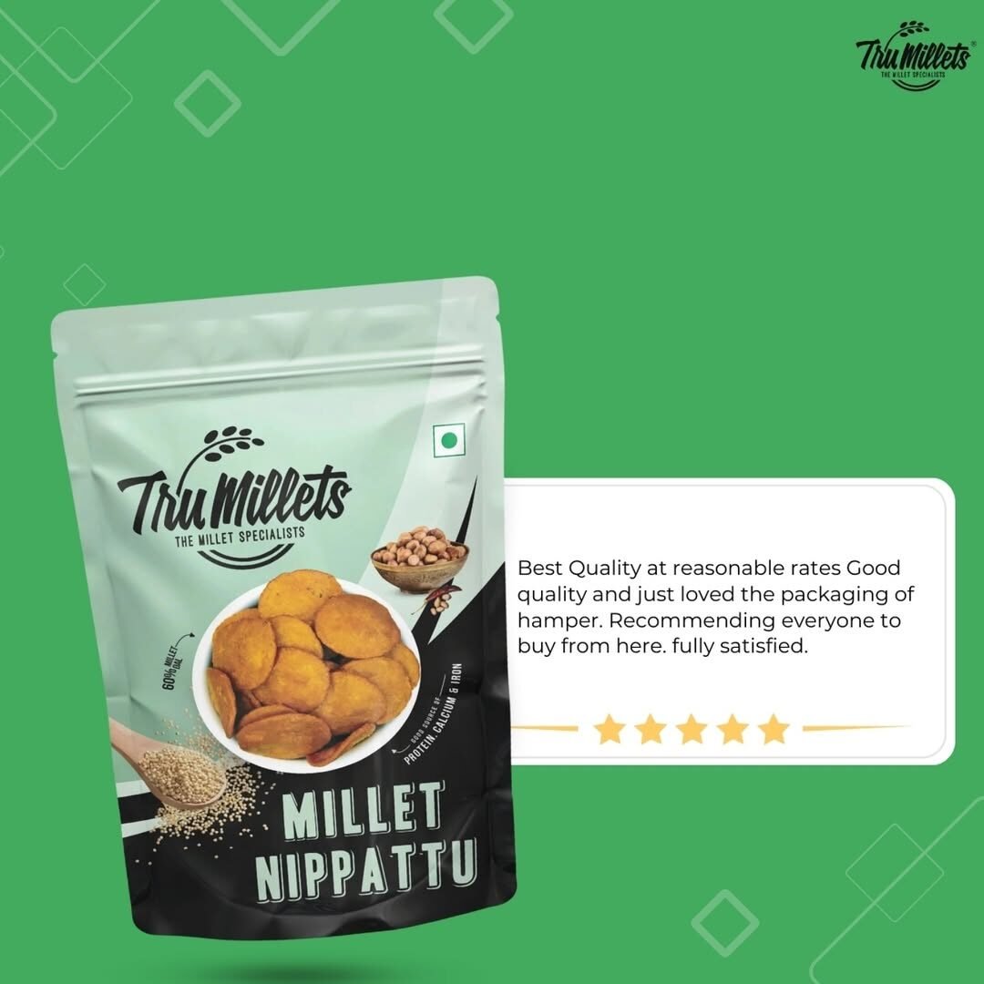 Crafted using wholesome natural ingredients such as rice flour, fried gram, groundnut, sesame seeds, curry leaves, and ghee, TruMillets Nippat is minimally processed and carefully sourced from trusted farmers to preserve both flavour and nutrition.